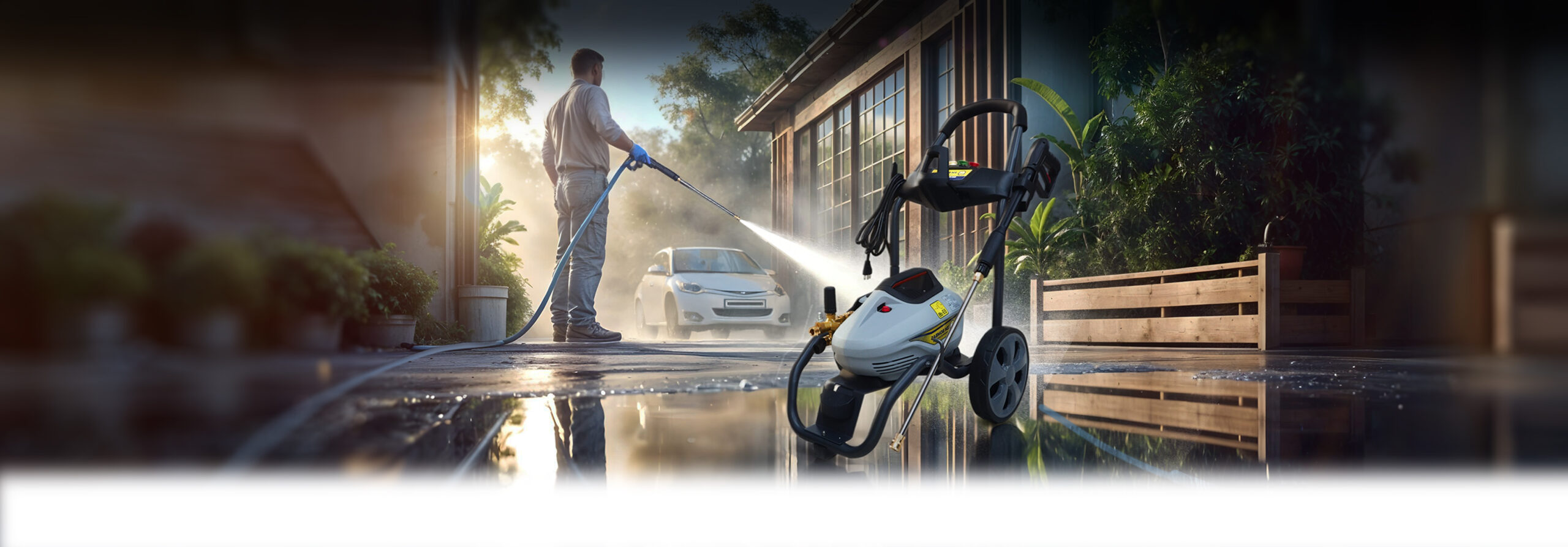 Conexão e Acessórios Práticos: Equipamento acompanha gatilho, mangueira de 8 metros com trama de aço, filtro e bicos de engate rápido, prontos para diferentes tipos de limpeza.