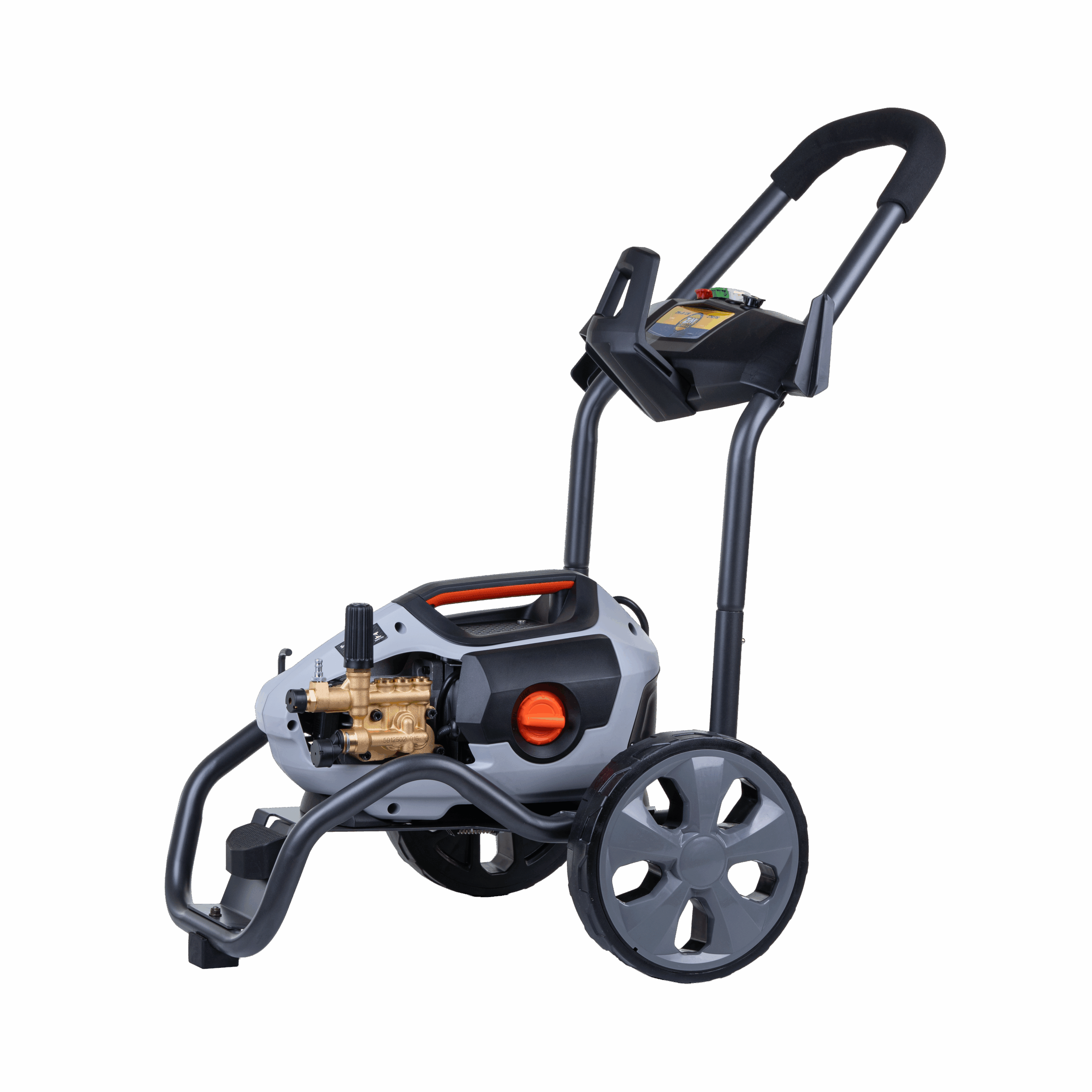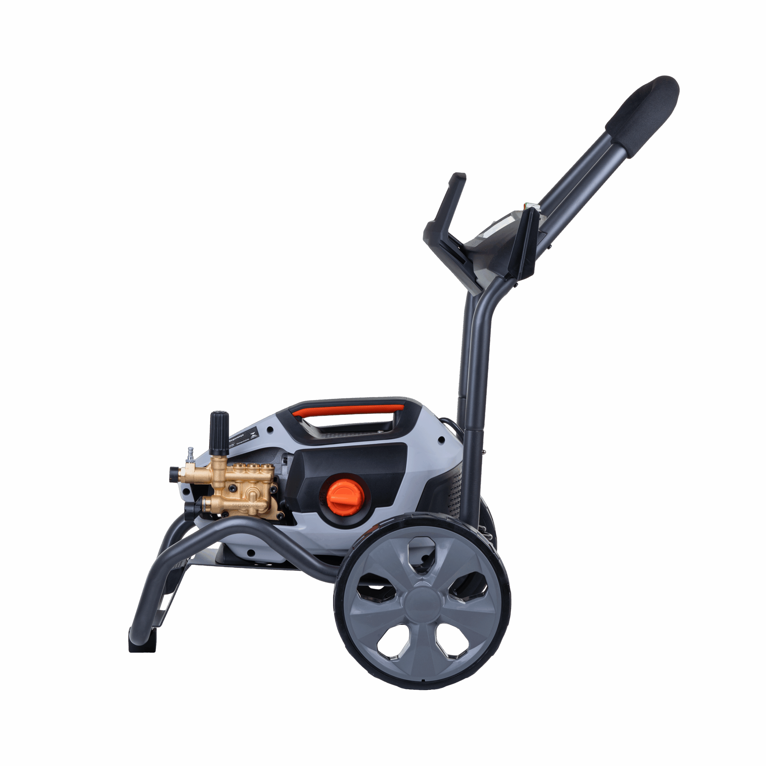 Ergonomia e Mobilidade: Carrinho ergonômico com rodas de 250mm revestidas de borracha, facilitando o transporte em terrenos acidentados. A bomba é removível, garantindo versatilidade no uso.